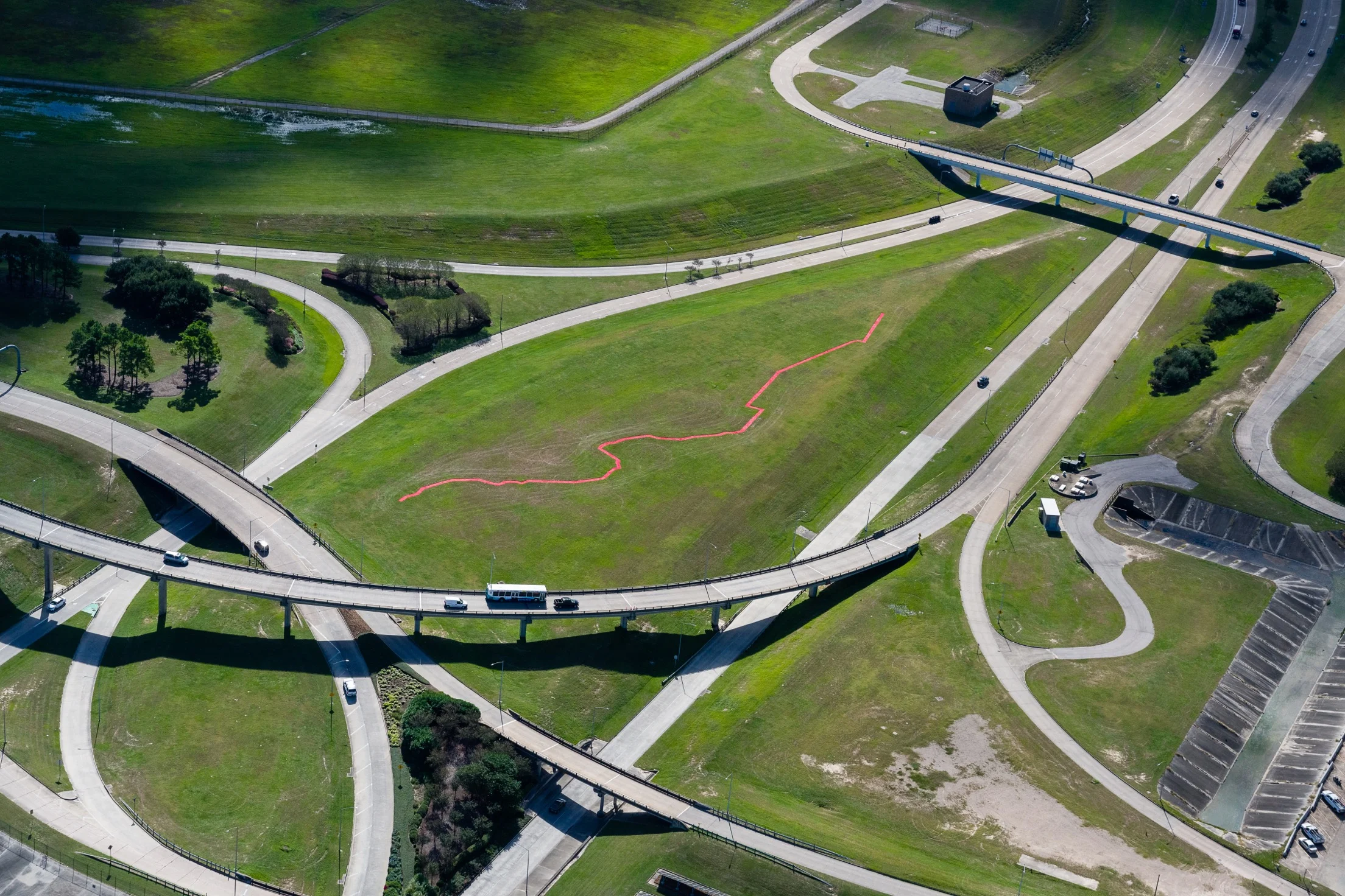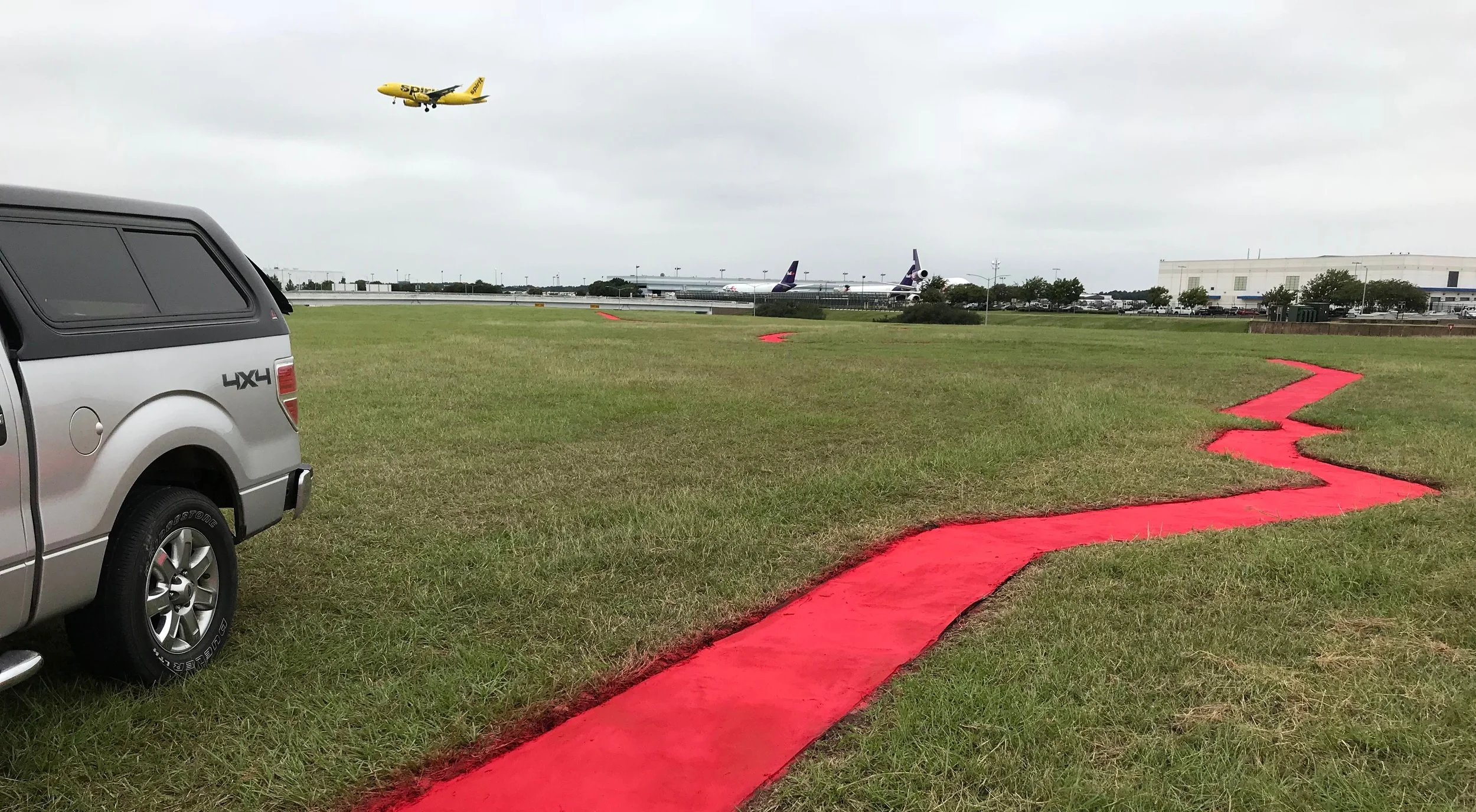 The idea was that the folks in those planes could look down, see the red line, and their curiosity could guide them to a brief internet search that leads to more awareness around human trafficking, especially in an environment (the airport) where this activity may take place in plain sight. That said, as the installer and not the artist, I’m not the best person to explain the idea behind this earthwork. Here’s an article with more detail.
