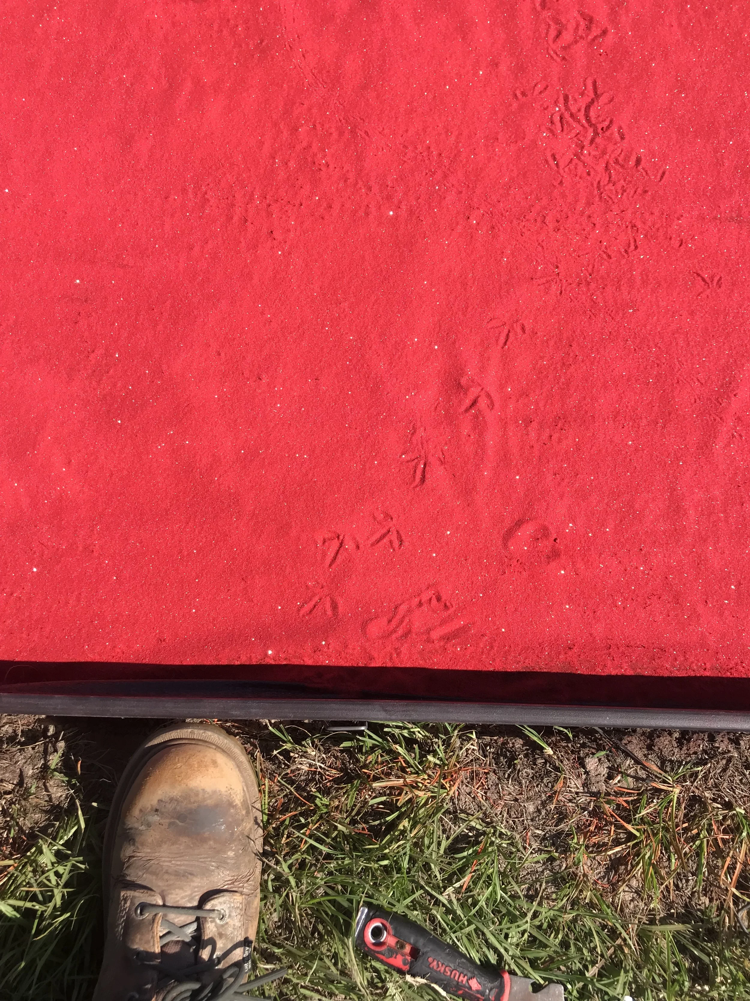We then laid out landscape fabric to create a necessary barrier between the earth and the sand and spread an amount of brilliant red sand that I can’t recall. It was a lot. We then stabilized the sand with a locally-contrived polymer, in this windy area atop a hill that lived just under a near-constant stream of freshly departed planes.