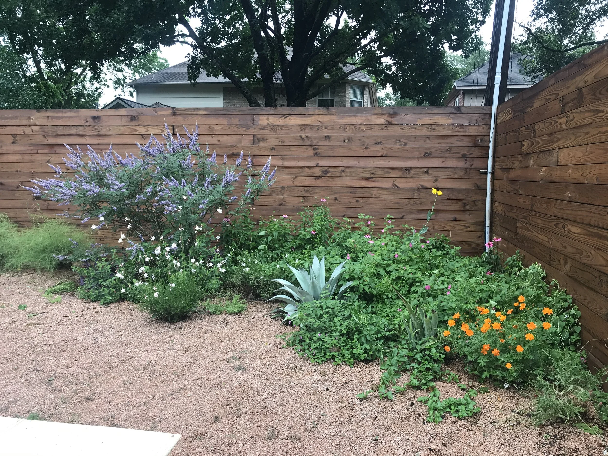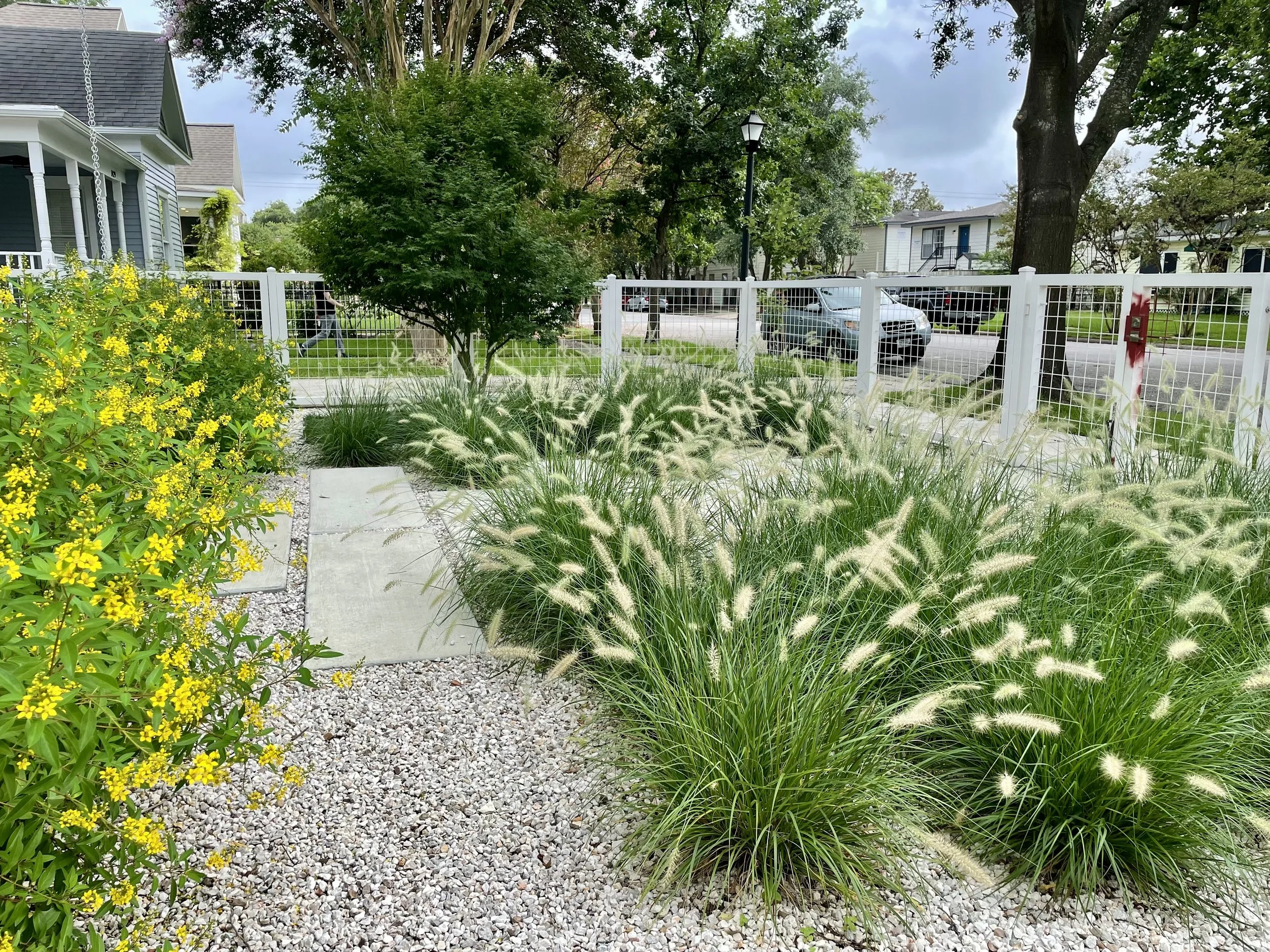 Xeriscape is kind of a naughty word in Houston. I don’t entirely want to be asked for this type of landscape with how much rain we get here but there IS A WAY IT CAN BE DONE but it is NOT THE XERO MAINTENANCE you think it might be. I overheard someone at a party say, “I’m so tired of mowing, I want to replace our lawn with gravel!” Nature is abundant and will grow grow grow here unless we really fully scorch the earth (if you want a lesson in abundance, start gardening in Houston) - so if you’d like to trade your mowing for using enough chemicals to risk altering the hormones and overall health of you, your family, and your immediate environment OR want to spend time pulling the many volunteers that will show up by their roots (landscape fabric doesn’t stop the birds from gardening and it traps roots of weeds so they can just keep re-sprouting), then go for it. Grading is critical in xeriscaping. Garden areas with cacti need to be BUILT UP so they stay high and dry. Soil needs to be on the sandy side. Surround them with arid-friendly plants like rock rose, guara, zexmenia, tall grasses, etc. When building up certain areas, drainage and runoff still needs to be accounted for and ideally managed within the landscape (without adding runoff to the neighbor’s yard). If the neighbors have grass on the other side of your shared fence, you can bet on it migrating over into your gravel spaces, so in this case I planted ground cover as a border along the fence. The homeowner wasn’t a fan of the ground cover - it was aggressive enough to be a strong natural border between the xeriscape and the neighbor’s lawns, but it was usurping gravel areas enough to grow over the “xeri” in xeriscape. Once I pulled it, the volunteers/weeds rushed in. This is where the negotiation comes in to making a xeriscape-like yard in Houston. It’s really hard to have bare earth in Houston as she wants to grow out of every spare inch (again, a blessing, if we know how to work with it), so we kind of choose our plants in Houston or they choose us. In planted areas where there is soil under just a bit of gravel, we need fully planted areas. We need to out-compete with chosen plants or we’ll be fighting the weeds until the earth gives up and when that happens… I don’t know, that’s kind of a sad day because it also makes life harder for your intentional plants nearby. There were designated gravel areas that were given a well compacted 2”+ crushed concrete base layer, and the planted areas were about 1” of crushed granite gravel over soil. It was hot shortly after our installation in the summer of 2020, and the big freeze hit Houston the following winter and the roots of most plants survived, so I don’t hate crushed granite gravel as mulch. It actually seemed to be a decent insulator. There’s a whole lot more to this but all that said, I got to see it through many beautiful seasons of maturity. These clients were truly wonderful and I’m grateful for the journey we got to take with their yard.