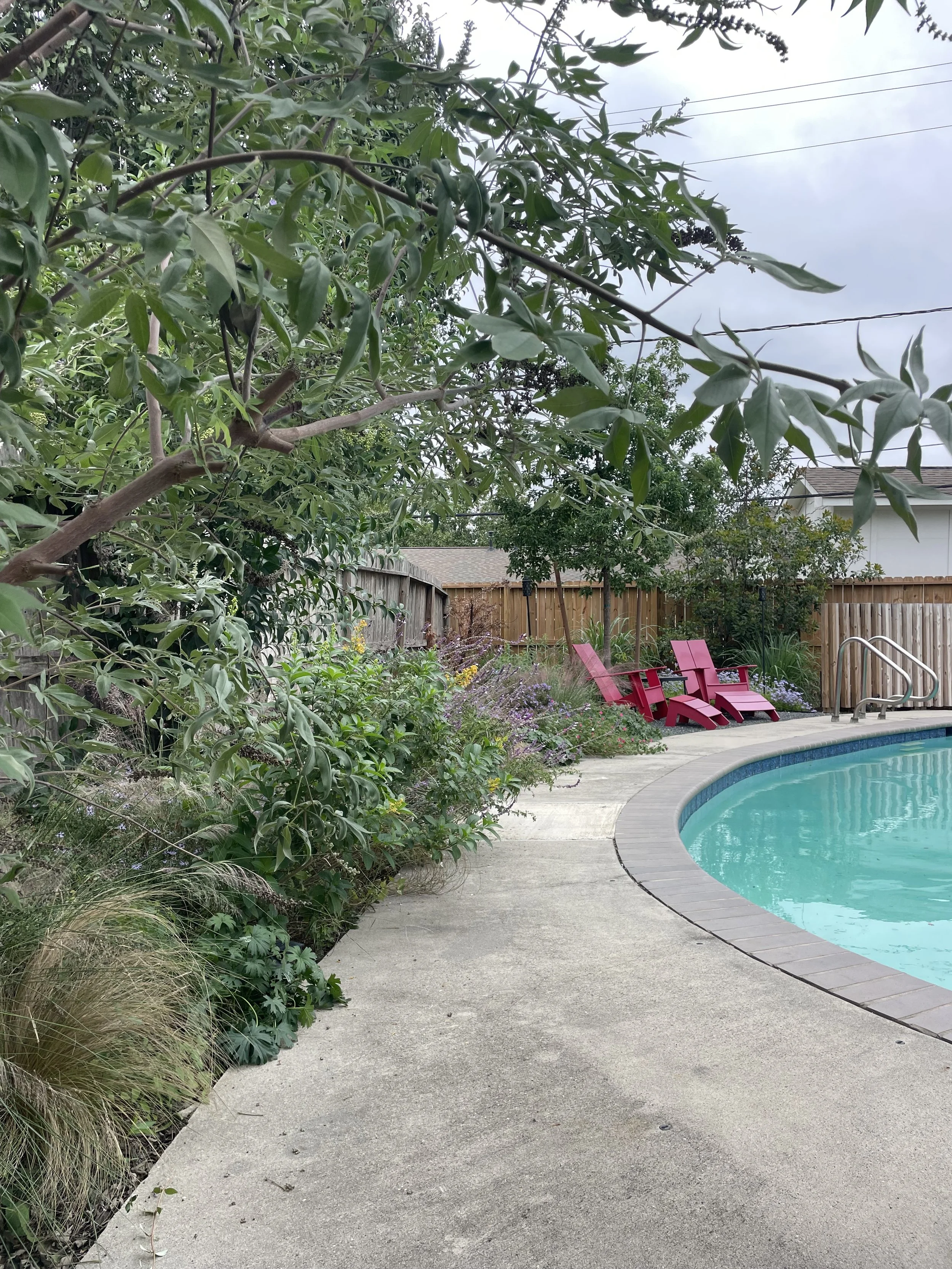 This landscape was designed by Falonland Studios and installed by me and my crews. Some of the features it included was a large Japanese maple (a treasured tree in this family), many perennial grasses set in gravel, thryallis along the house, about six citrus trees in various parts of the yard, vines on trellises, large rain chains, a large garden bed for herbs in the back, a redbud tree as a statement piece outside of a large window, a large patch along the driveway for pollinator friendly perennials, and a pool with a backdrop of multi-trunked wax myrtles.