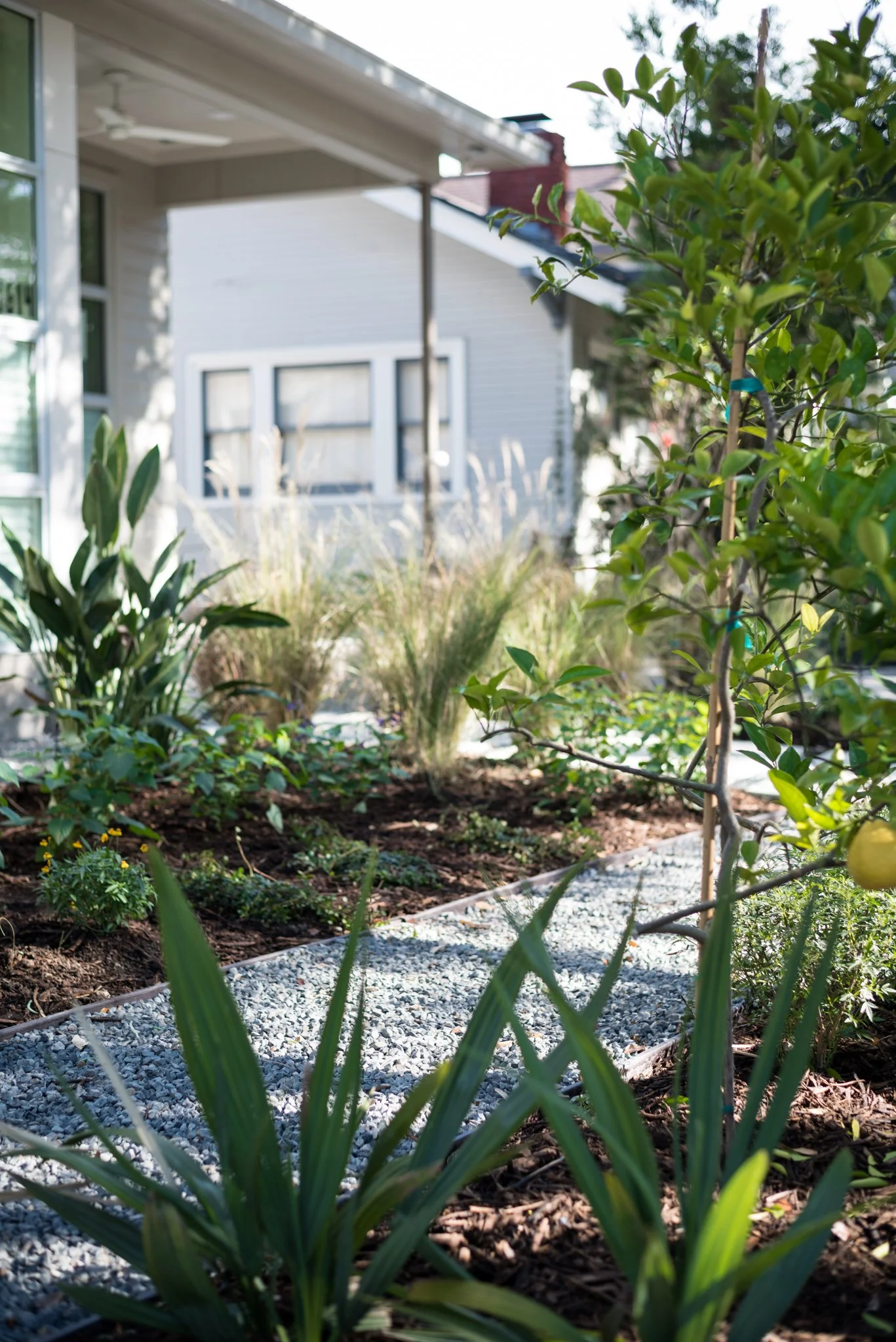 We created a flagstone patio area in the back and laced the rest of the yard and gardens with gravel walkways. Gardens take up half of all square footage with tough, drought-tolerant, no-water plants like maiden grasses, a bottlebrush tree, salvia guaranatica, Texas terragon, native palmetto, copper canyon daisies, irises and Moringa trees.